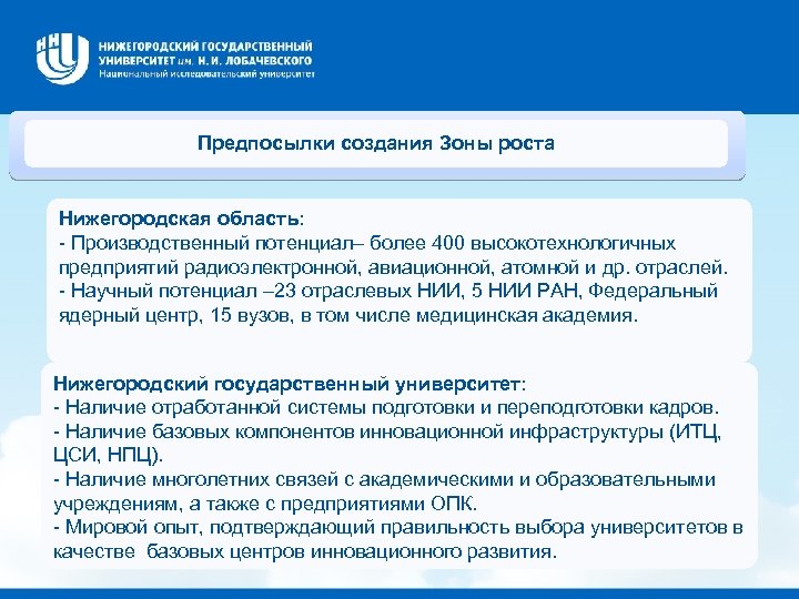 Предпосылки создания Зоны роста Нижегородская область: - Производственный потенциал– более 400 высокотехнологичных предприятий радиоэлектронной, авиационной, атомной и др. отраслей. - Научный потенциал – 23 отраслевых НИИ, 5 НИИ РАН, Федеральный ядерный центр, 15 вузов, в том числе медицинская академия. Нижегородский государственный университет: - Наличие отработанной системы подготовки и переподготовки кадров. - Наличие базовых компонентов инновационной инфраструктуры (ИТЦ, ЦСИ, НПЦ). - Наличие многолетних связей с академическими и образовательными учреждениям, а также с предприятиями ОПК. - Мировой опыт, подтверждающий правильность выбора университетов в качестве базовых центров инновационного развития.