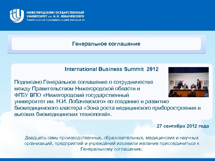 Генеральное соглашение International Business Summit 2012 Подписано Генеральное соглашение о сотрудничестве между Правительством Нижегородской области и ФГБУ ВПО «Нижегородский государственный университет им. Н. И. Лобачевского» по созданию и развитию биомедицинского кластера «Зона роста медицинского приборостроения и высоких биомедицинских технологий» . 27 сентября 2012 года Двадцать семь производственных, образовательных, медицинских и научных организаций, предприятий и учреждений изъявили желание присоединиться к Генеральному соглашению.