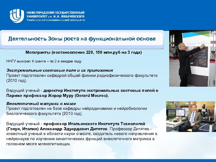 Деятельность Зоны роста на функциональной основе Мегагранты (постановление 220, 150 млн. руб на 3 года) ННГУ выиграл 4 гранта – по 2 в каждом году. Экстремальные световые поля и их приложения Проект подготовлен кафедрой общей физики радиофизического факультета (2010 год). Ведущий ученый - директор Института экстремальных световых полей в Париже профессор Жерар Муру (Gerard Mourou). Внеклеточный матрикс в мозге Проект подготовлен на базе кафедры нейродинамики и нейробиологии биологического факультета (2010 год). Ведущий ученый - профессор Итальянского Института Технологий (Генуя, Италия) Александр Эдуардович Дитятев. Профессор Дитятев - известный ученый в области науки о мозге, создатель нового направления в нейронауке по изучению синаптических функций внеклеточного матрикса в головном мозге млекопитающих.