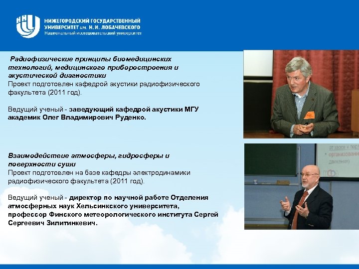 Радиофизические принципы биомедицинских технологий, медицинского приборостроения и акустической диагностики Проект подготовлен кафедрой акустики радиофизического факультета (2011 год). Ведущий ученый - заведующий кафедрой акустики МГУ академик Олег Владимирович Руденко. Взаимодействие атмосферы, гидросферы и поверхности суши Проект подготовлен на базе кафедры электродинамики радиофизического факультета (2011 год). Ведущий ученый - директор по научной работе Отделения атмосферных наук Хельсинкского университета, профессор Финского метеорологического института Сергей Сергеевич Зилитинкевич.