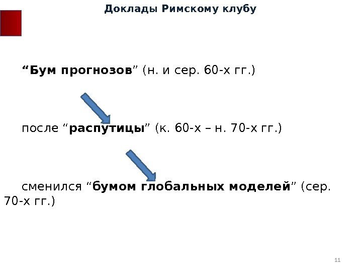 “ Бум прогнозов ” (н. и сер. 60 -х гг. ) после “ распутицы ” (к. 60 -х – н. 70 -х гг. ) сменился “ бумом глобальных моделей ” (сер. 70 -х гг. ) Доклады Римскому клубу