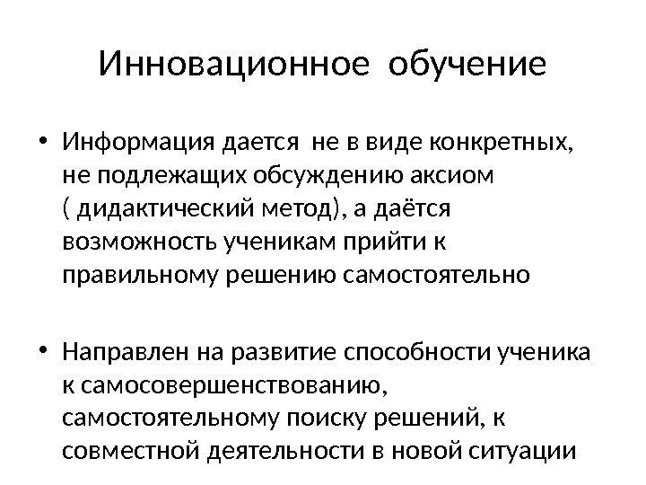 • Информация дается не в виде конкретных, не подлежащих обсуждению аксиом ( дидактический метод), а даётся возможность ученикам прийти к правильному решению самостоятельно • Направлен на развитие способности ученика к самосовершенствованию, самостоятельному поиску решений, к совместной деятельности в новой ситуации Инновационное обучение