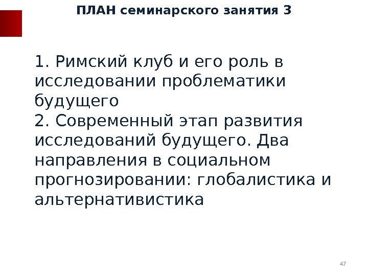 1. Римский клуб и его роль в исследовании проблематики будущего 2. Современный этап развития исследований будущего. Два направления в социальном прогнозировании: глобалистика и альтернативистика 47 ПЛАН семинарского занятия