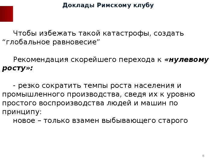 Чтобы избежать такой катастрофы, создать “глобальное равновесие” Рекомендация скорейшего перехода к «нулевому росту» : — резко сократить темпы роста населения и промышленного производства, сведя их к уровню простого воспроизводства людей и машин по принципу: новое – только взамен выбывающего старого Доклады Римскому клубу