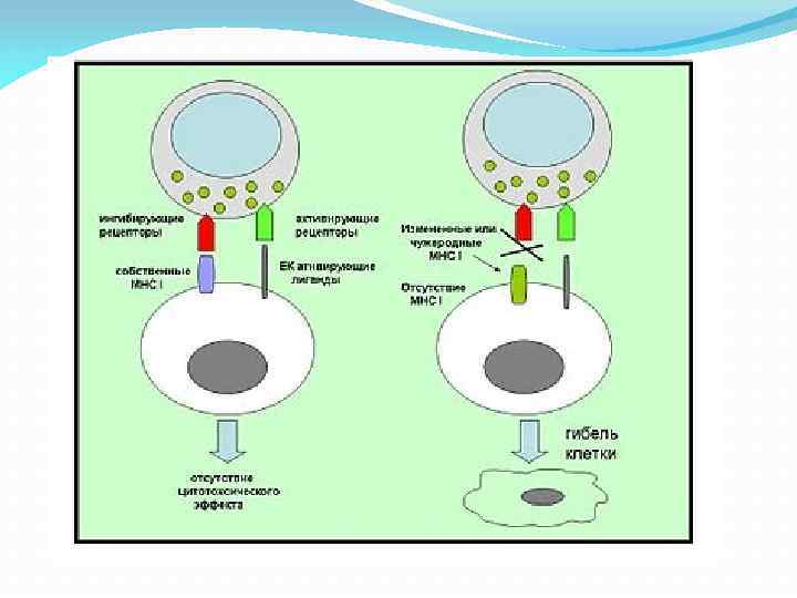 Регуляторные рецепторы Регуляторные рецепторы, связываясь с неповреждёнными молекулами MHC I, индуцируют ингибиторный сигнал, подавляя активацию NK. Связывание активирующих рецепторов NK со своими лигандами (присутствующими только на повреждённых клетках) активирует цитотоксическую функцию NK.