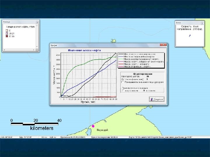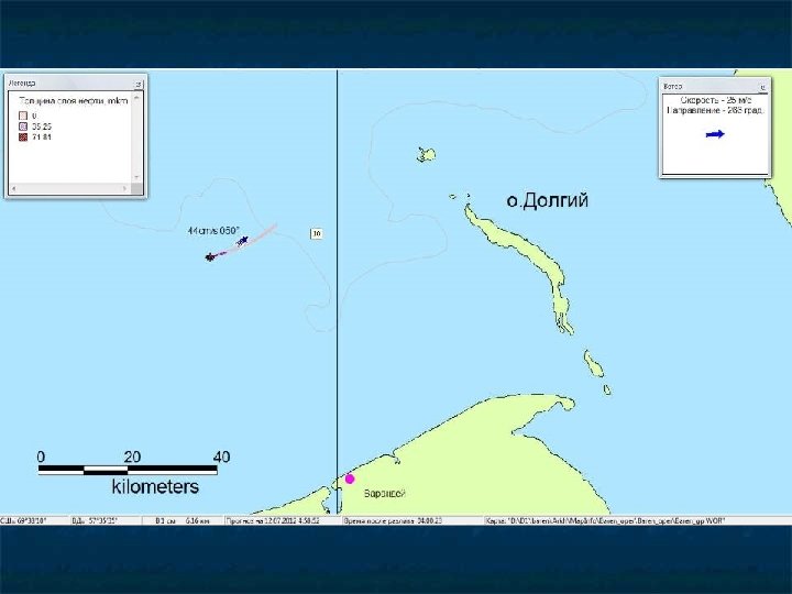 РАСЧЕТНЫЕ СЦЕНАРИИ (16000 тонн/5 сут, поражение о-вов Матвеев и Долгий, 96 часов) Время достижения береговой линии 44 ч. Суммарная длина поражённой береговой линии 56124 м. Масса на берегу = 235 т. Ветер, м/сек Течение, см/сек