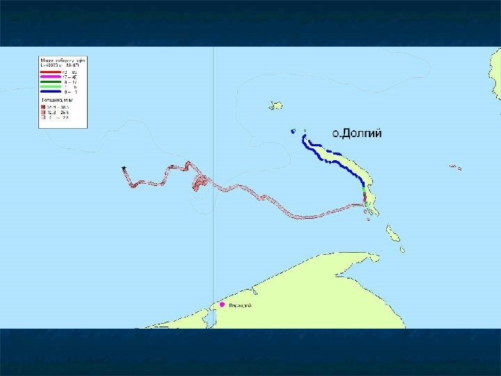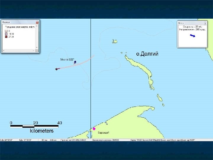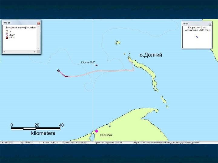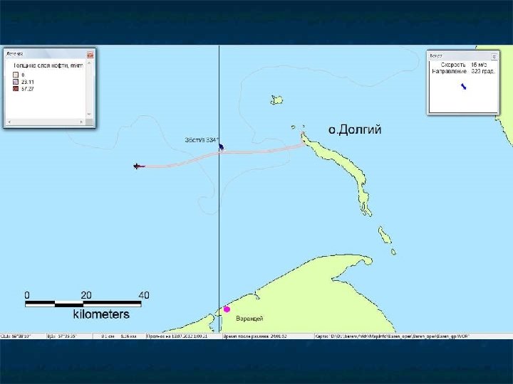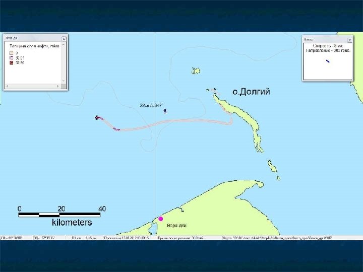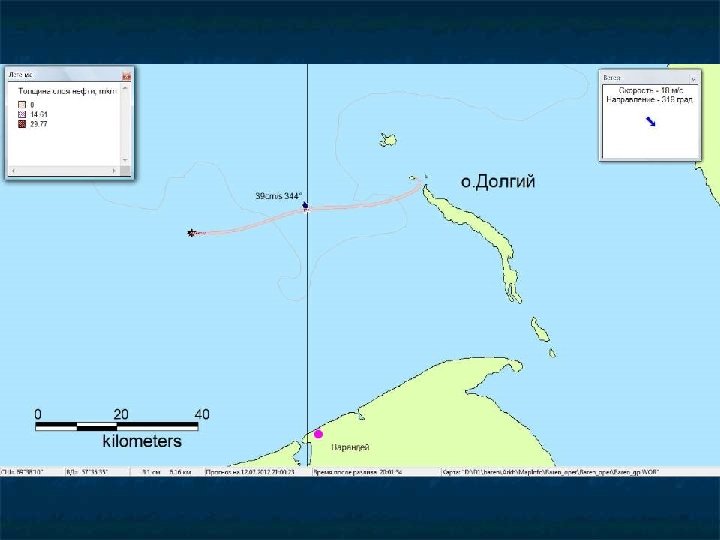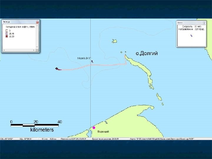 РАСЧЕТНЫЕ СЦЕНАРИИ (16000 тонн/5 сут, поражение о-вов Матвеев и Долгий, 96 часов) Динамика переноса Ветер, м/сек Время достижения береговой линии 17 ч. (о-в …) Суммарная длина поражённой б. л. 40 км. Масса на берегу = 87 т. Течение, см/сек