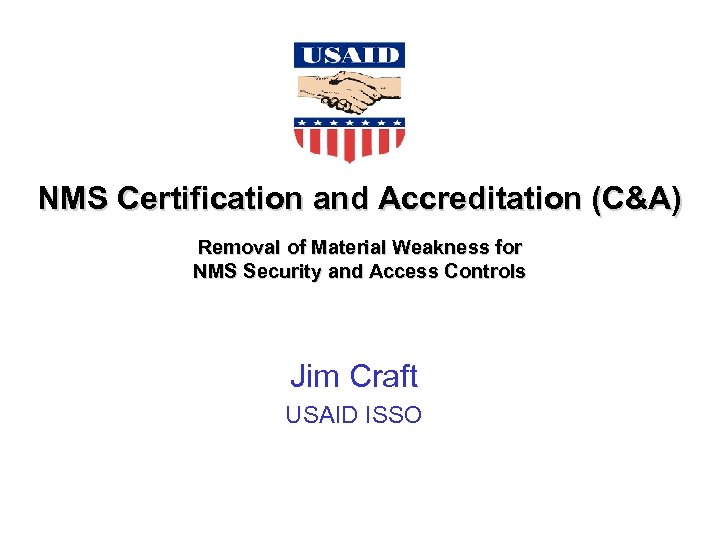 NMS Certification and Accreditation (C&A) Removal of Material Weakness for NMS Security and Access Controls Jim Craft USAID ISSO