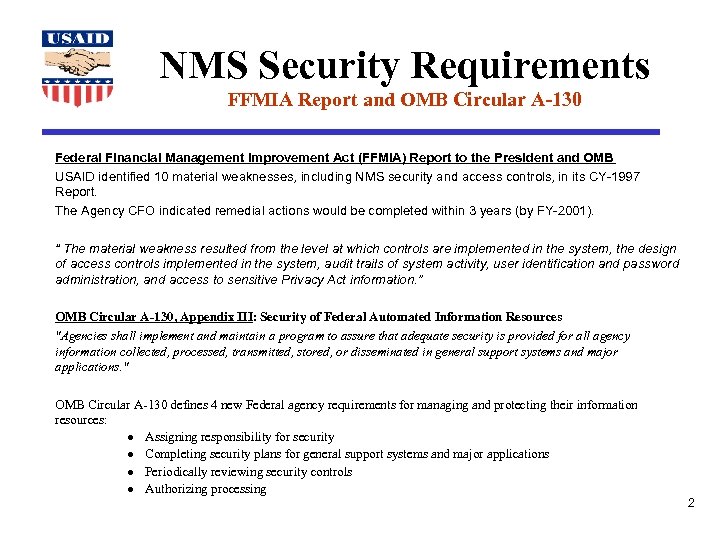 NMS Security Requirements FFMIA Report and OMB Circular A-130 Federal Financial Management Improvement Act (FFMIA) Report to the President and OMB USAID identified 10 material weaknesses, including NMS security and access controls, in its CY-1997 Report. The Agency CFO indicated remedial actions would be completed within 3 years (by FY-2001). “ The material weakness resulted from the level at which controls are implemented in the system, the design of access controls implemented in the system, audit trails of system activity, user identification and password administration, and access to sensitive Privacy Act information. ” OMB Circular A-130, Appendix III: Security of Federal Automated Information Resources "Agencies shall implement and maintain a program to assure that adequate security is provided for all agency information collected, processed, transmitted, stored, or disseminated in general support systems and major applications. " OMB Circular A-130 defines 4 new Federal agency requirements for managing and protecting their information resources: · Assigning responsibility for security · Completing security plans for general support systems and major applications · Periodically reviewing security controls · Authorizing processing 2