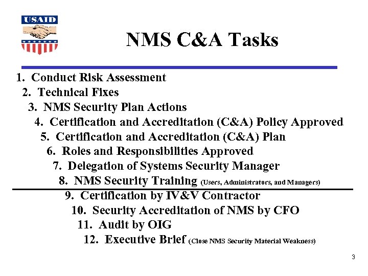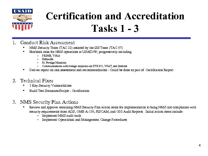 Certification and Accreditation Tasks 1 - 3 1. Conduct Risk Assessment NMS Security Team (TAC 22) assisted by the ISS Team (TAC 07) Establish risks for NMS operations at USAID/W, progressively including – – PRIME, T-Hub Beltsville 81 Foreign Missions Communications with foreign missions via DTS-PO, VSAT, and Internet Deliver report on risk assessment and recommendations - Could be done as part of Certification Report 2. Technical Fixes 5 Key Security Vulnerabilities Build Test Scenarios/Scripts - Certification 3. NMS Security Plan Actions Review and approve remaining NMS Security Plan action items for implementation to bring NMS into compliance with security requirements from ADS, OMB A-130, FISCAM, and OIG Audit Reports. Initial action items include: – Implement NMS audit trails – Implement Operational and Management Change Procedures 4
