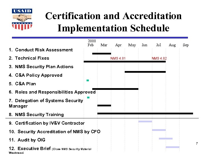 Certification and Accreditation Implementation Schedule 1. Conduct Risk Assessment 2000 Feb 2. Technical Fixes Mar Apr NMS 4. 81 May Jun Jul Aug Sep NMS 4. 82 3. NMS Security Plan Actions 4. C&A Policy Approved 5. C&A Plan 6. Roles and Responsibilities Approved 7. Delegation of Systems Security Manager 8. NMS Security Training 9. Certification by IV&V Contractor 10. Security Accreditation of NMS by CFO 11. Audit by OIG 12. Executive Brief (Close NMS Security Material Weakness) 7