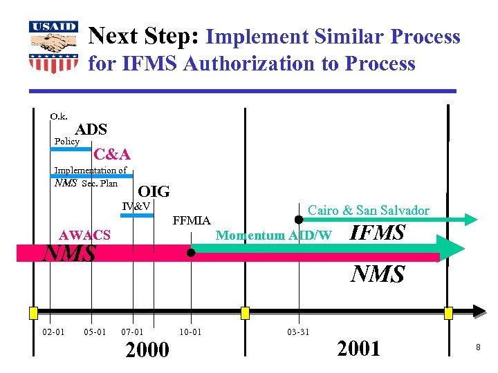 Next Step: Implement Similar Process for IFMS Authorization to Process O. k. ADS Policy C&A Implementation of NMS Sec. Plan OIG IV&V FFMIA AWACS NMS 02 -01 05 -01 Cairo & San Salvador Momentum AID/W IFMS NMS 07 -01 2000 10 -01 03 -31 2001 8