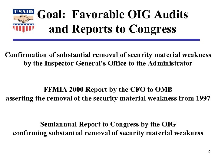 Goal: Favorable OIG Audits and Reports to Congress Confirmation of substantial removal of security material weakness by the Inspector General’s Office to the Administrator FFMIA 2000 Report by the CFO to OMB asserting the removal of the security material weakness from 1997 Semiannual Report to Congress by the OIG confirming substantial removal of security material weakness 9