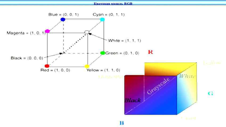 Схемы цветообразования МОДЕЛЬ RGB Эта модель описывает излучаемые цвета. Она является трехканальной, основана на трёх основных (базовых) цветах: красный (Red), зелёный (Green) и синий (Blue) Остальные цвета получаются сочетанием базовых В компьютере каждый канал кодируется одним байтом, т. е. каждый базовый цвет может принимать значения от 0 до 255 (в десятичной) или от 00 до FF (в шестнадцатеричной) - пространственное представление модели RGB в виде куба