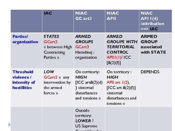 IAC NIAC Lebanon 2006, Georgia Often more than one conflict at a time. Individually assessed. Iraq, Afghanistan Iraq, Georgia Objective assessment Reason for conflict not relevant The opinion of parties not decisive underlying reality Formalist approach. Westphalian order. Point of departure : State or non-state ?