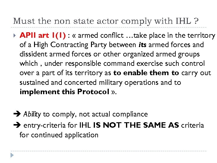 Must the non state actor comply with IHL ? APII art 1(1) : « armed conflict …take place in the territory of a High Contracting Party between its armed forces and dissident armed forces or other organized armed groups which , under responsible command exercise such control over a part of its territory as to enable them to carry out sustained and concerted military operations and to implement this Protocol » . Ability to comply, not actual compliance entry-criteria for IHL IS NOT THE SAME AS criteria for continued application