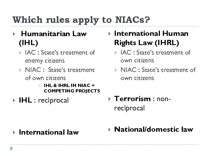 Which rules apply to NIACs? Humanitarian Law (IHL) IAC : State’s treatment of enemy citizens NIAC : State’s treatment of own citizens International Human Rights Law (IHRL) IAC : State’s treatment of own citizens NIAC : State’s treatment of own citizens IHL & IHRL IN NIAC = COMPETING PROJECTS IHL : reciprocal Terrorism : nonreciprocal International law National/domestic law