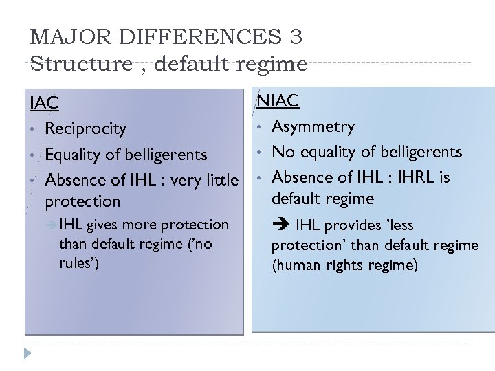 MAJOR DIFFERENCES 3 Structure , default regime NIAC • Asymmetry • Reciprocity • No equality of belligerents • Equality of belligerents • Absence of IHL : very little • Absence of IHL : IHRL is default regime protection IHL gives more protection IHL provides ’less than default regime (’no rules’) protection’ than default regime (human rights regime)