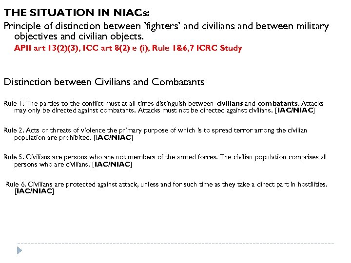 THE SITUATION IN NIACs: Principle of distinction between ’fighters’ and civilians and between military objectives and civilian objects. APII art 13(2)(3), ICC art 8(2) e (i), Rule 1&6, 7 ICRC Study Distinction between Civilians and Combatants Rule 1. The parties to the conflict must at all times distinguish between civilians and combatants. Attacks may only be directed against combatants. Attacks must not be directed against civilians. [IAC/NIAC] Rule 2. Acts or threats of violence the primary purpose of which is to spread terror among the civilian population are prohibited. [IAC/NIAC] Rule 5. Civilians are persons who are not members of the armed forces. The civilian population comprises all persons who are civilians. [IAC/NIAC] Rule 6. Civilians are protected against attack, unless and for such time as they take a direct part in hostilities. [IAC/NIAC]