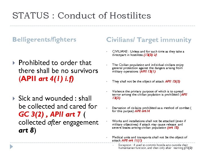 STATUS : Conduct of Hostilites Belligerents/fighters Civilians/ Target immunity • Prohibited to order that there shall be no survivors (APII art 4(1) i. f) Sick and wounded : shall be collected and cared for GC 3(2) , APII art 7 ( collected after engagement art 8) • The Civilian population and individual civilians enjoy general protection against the dangers arising from military operations (APII 13(1) • They shall not be the object of attack APII 13(2) • CIVILIANS : Unless and for such time as they take a directpart in hostilites (13(3) i. f: Violence the primary purpose of which is to spread terror among the civilian poplation is prohibited (APII 13(2) • Starvation of civilains prohibited as a method of combat ( for this purpse) APII art 14 • Works and installations shall not be attacked (even if military objectives) if attack may cause release and severe losses among civilian population (art 15) • Medical units and transports shall not be the object of attack APII art 11(1) – Exception : if used to commit hostile acts outside their humanitarian function, and then only after warning (11(2)