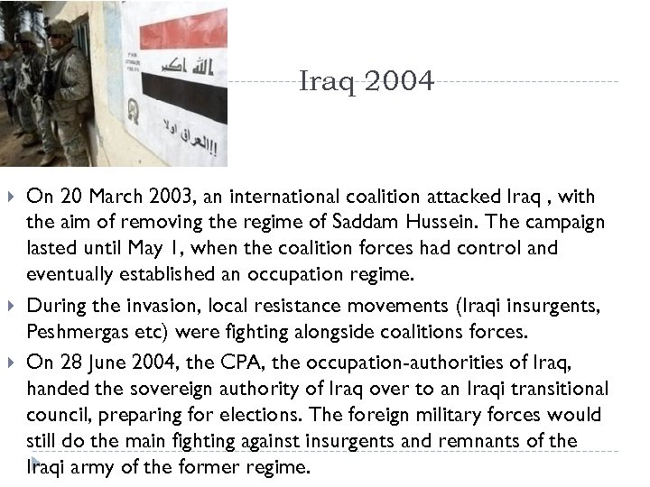 Iraq 2004 On 20 March 2003, an international coalition attacked Iraq , with the aim of removing the regime of Saddam Hussein. The campaign lasted until May 1, when the coalition forces had control and eventually established an occupation regime. During the invasion, local resistance movements (Iraqi insurgents, Peshmergas etc) were fighting alongside coalitions forces. On 28 June 2004, the CPA, the occupation-authorities of Iraq, handed the sovereign authority of Iraq over to an Iraqi transitional council, preparing for elections. The foreign military forces would still do the main fighting against insurgents and remnants of the Iraqi army of the former regime.
