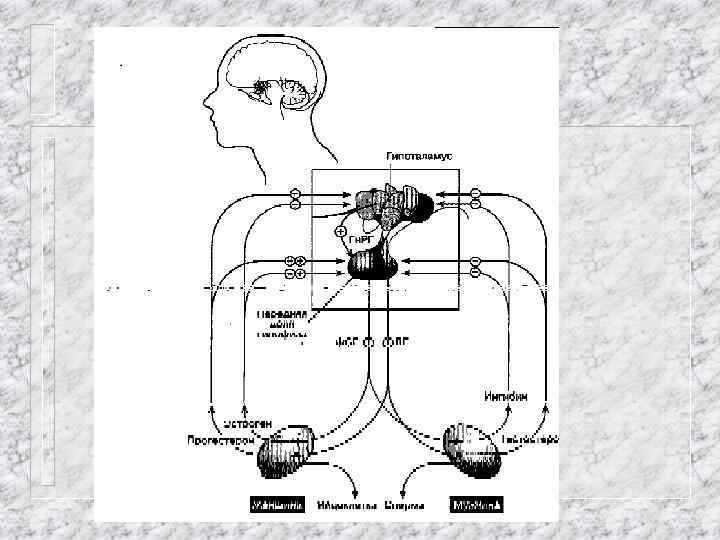 ИЕРАРХИЧЕСКИЙ ПРИНЦИП ОРГАНИЗАЦИИ РЕПРОДУКТИВНОЙ СИСТЕМЫ (РС) ВНЕШНЯЯ СРЕДА НАДГИПОТАЛАМИЧЕСКИЕ СТРУКТУРЫ НЕЙРОТРАНСМИТТЕРЫ ГИПОТАЛАМУС ОКСИТОЦИН ЛГРГ ПЕРЕДНЯЯ ДОЛЯ ГИПОФИЗА Прл ЛГ ФСГ ЯИЧНИК П Э А Р ОРГАНЫ И ТКАНИ МИШЕНИ И