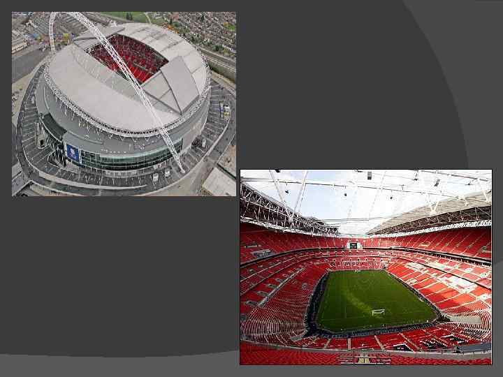 Стадион Уэмбли новый стадион (на данный момент самый большой в мире) был открыт в 2007 году на месте старой легендарной арены. На красных трибунах «Уэмбли» умещаются 90 тысяч зрителей. Изюминка арены - 130 -метровая ажурная арка, сделанная не для красоты, а для поддержки уникальной раздвижной крыши, способной «отползать» на восток, запад и юг. Благодаря такой крыше, на поле не отбрасывается тень, и трава растет быстрее. Арка ярко освещается, и в темное время суток ее видно со всех концов Лондона. Попасть на трибуны стадиона можно не только взбираясь по ступенькам, но и поднимаясь по эскалаторам, общая длина которых превышает 400 метров. Интересный факт Арка «Уэмбли» имеет больший диаметр поперечного сечения, чем железнодорожный туннель под Ла. Маншем, который соединяет Лондон с Парижем.