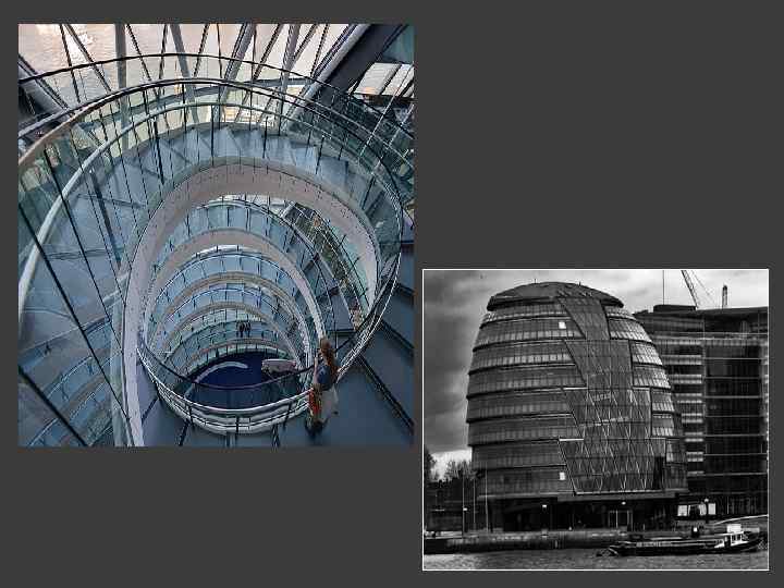 Сити-холл Сити- холл еще одно лондонское творение Нормана Фостера сравнивали то с мотоциклетным шлемом, то с коконом. Но больше всего это здание на набережной Темзы, неподалеку от Тауэрского моста, похоже на яйцо, тонко нарезанное ломтиками. Архитектор объяснял смысл своей задумки стремлением уменьшить площадь поверхности «Сити-холла» и сэкономить потребляемую электроэнергию. Однако критики лихо прошлись по «энергосберегающим» свойствам строения и даже произвели необходимые замеры, доказывающие, что экономии нет и в помине. Споры на эту тему регулярно вспыхивают до сих пор. Интересный факт Здание покрывают 3844 стеклянные панели. Ни одна из них не повторяет другую. Каждый лист вырезался лазером по уникальному лекалу.