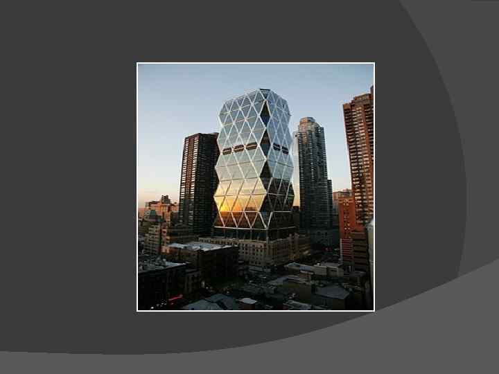 Хёрст-тауэр Хёрст-тауэр- под крышей главного здания корпорации Hearst в Нью. Йорке сидят печатные «монстры» Cosmopolitan и Esquire, а также другие издания. Фостер построил сверкающую башню не с нуля: она выросла внутри фасада старого здания, которое появилось еще в 30 -х годах. Тогда возведение башни было прервано из-за Великой депрессии. 70 лет спустя английский архитектор возвел для медиа-империи Хёрста новый дом. Треугольная башня «опутана» обожаемой Фостером сетчатой оболочкой. Гигантские окна покрыты панелями из бронированного стекла – каждая высотой в четыре этажа. Большая часть металла, который ушел на строительство этого 46 -этажного здания на Манхэттене, была продуктом вторичной переработки. Интересный факт При постройке башни Норман Фостер в очередной раз применил экологические инновации: сделал так, чтобы дождевая вода, скапливающаяся в резервуарах на крыше, использовалась для полива растений и работы кондиционеров, а обводящие здание потоки воздуха помогали вентилированию.