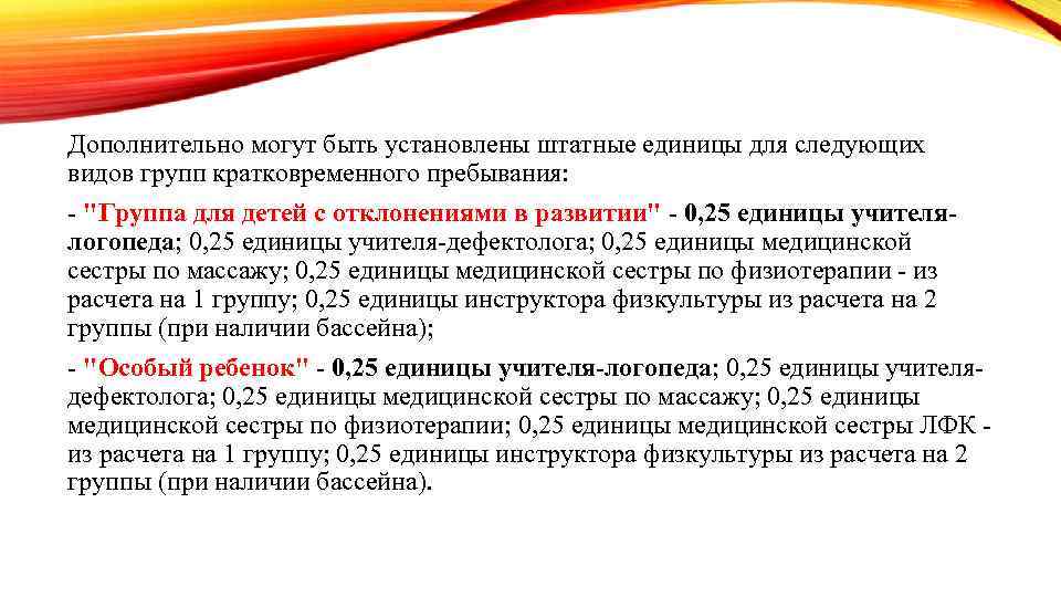 Дополнительно могут быть установлены штатные единицы для следующих видов групп кратковременного пребывания: - "Группа для детей с отклонениями в развитии" - 0, 25 единицы учителялогопеда; 0, 25 единицы учителя-дефектолога; 0, 25 единицы медицинской сестры по массажу; 0, 25 единицы медицинской сестры по физиотерапии - из расчета на 1 группу; 0, 25 единицы инструктора физкультуры из расчета на 2 группы (при наличии бассейна); - "Особый ребенок" - 0, 25 единицы учителя-логопеда; 0, 25 единицы учителядефектолога; 0, 25 единицы медицинской сестры по массажу; 0, 25 единицы медицинской сестры по физиотерапии; 0, 25 единицы медицинской сестры ЛФК из расчета на 1 группу; 0, 25 единицы инструктора физкультуры из расчета на 2 группы (при наличии бассейна).