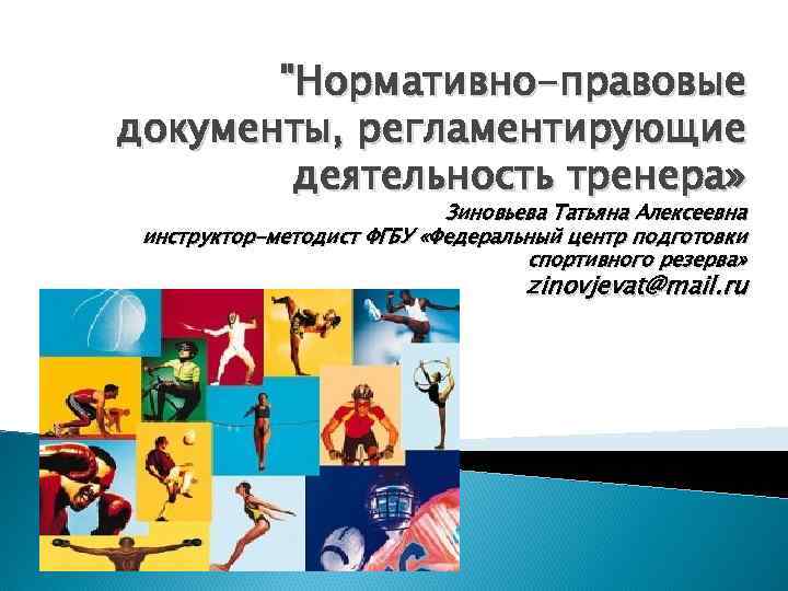 "Нормативно-правовые документы, регламентирующие деятельность тренера» Зиновьева Татьяна Алексеевна инструктор-методист ФГБУ «Федеральный центр подготовки спортивного резерва» zinovjevat@mail. ru