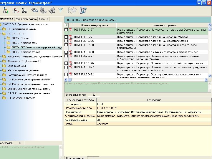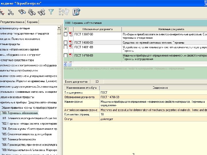• Для работы с информацией фонда на предприятии внедрена система «Нормо. Контроль» (Свидетельства государственной регистрации №№ 2005620203, 2005610973, 2007611135). Система позволяет: • - создавать электронные библиотеки научно-технической информации, исходя из потребностей в нормативно-технической документации структурных подразделений конкретного предприятия; • - формировать локальные сети доступа к информационным ресурсам нормативно-технической документации; • - создавать автоматизированные места с удобным пользовательским интерфейсом и мощным поисковым аппаратом. Информационная система обеспечивает предприятия актуальными нормативными документами, необходимыми в хозяйственной деятельности, в т. ч. для разработки и внедрения систем экологического менеджмента.