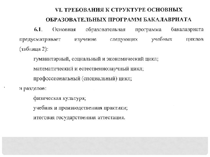 АНАЛИЗ ПРОЕКТА ФГОС 3+ 6. 12. Образовательная организация обеспечивает участие в реализации программ бакалавриата с присвоением выпускникам квалификации «прикладной бакалавр» в части дисциплин (модулей), обеспечивающих подготовку обучающихся к получению квалификационных разрядов по одной или нескольким профессиям рабочих (должностям служащих), мастеров производственного обучения и (или) работников иных организаций, осуществляющих профессиональную деятельность по профилям соответствующих программ. 6. 13. Порядок проектирования и реализации программ бакалаврита определяются образовательной организацией на основе: порядка организации и осуществления образовательной деятельности по программам бакалавриата, программам специалитета, программам магистратуры; порядка проведения государственной итоговой аттестации по программам бакалавриата, программам специалитета, программам магистратуры; положения о практике обучающихся, осваивающих образовательные программы высшего образования.