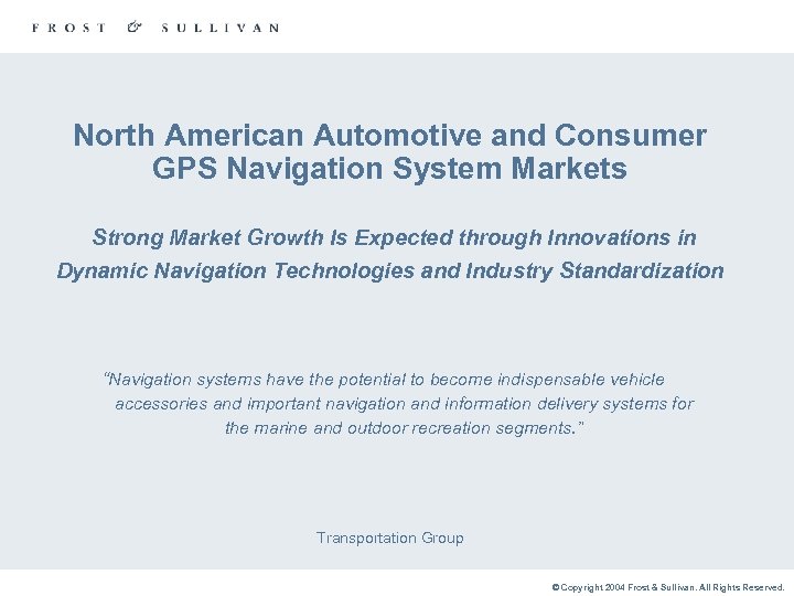 North American Automotive and Consumer GPS Navigation System Markets Strong Market Growth Is Expected through Innovations in Dynamic Navigation Technologies and Industry Standardization “Navigation systems have the potential to become indispensable vehicle accessories and important navigation and information delivery systems for the marine and outdoor recreation segments. ” Transportation Group © Copyright 2004 Frost & Sullivan. All Rights Reserved.