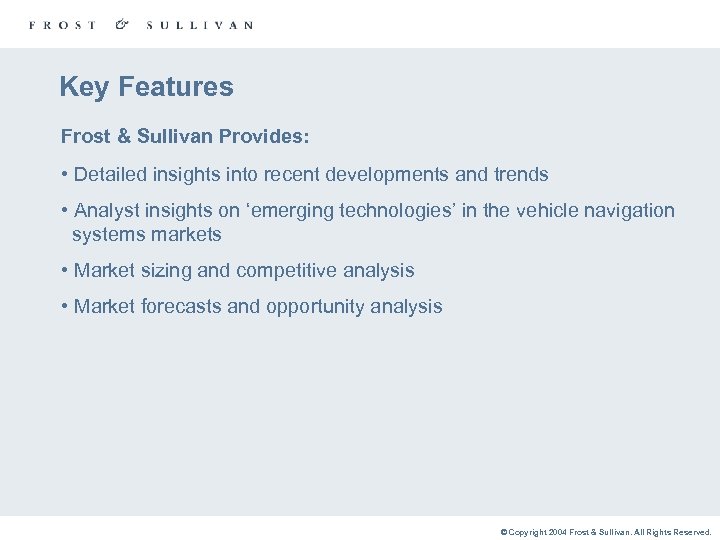 Key Features Frost & Sullivan Provides: • Detailed insights into recent developments and trends • Analyst insights on ‘emerging technologies’ in the vehicle navigation systems markets • Market sizing and competitive analysis • Market forecasts and opportunity analysis © Copyright 2004 Frost & Sullivan. All Rights Reserved.