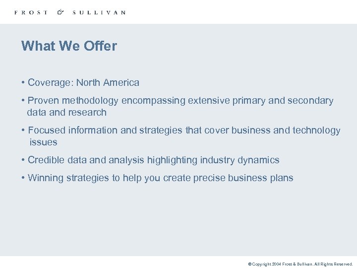 What We Offer • Coverage: North America • Proven methodology encompassing extensive primary and secondary data and research • Focused information and strategies that cover business and technology issues • Credible data and analysis highlighting industry dynamics • Winning strategies to help you create precise business plans © Copyright 2004 Frost & Sullivan. All Rights Reserved.