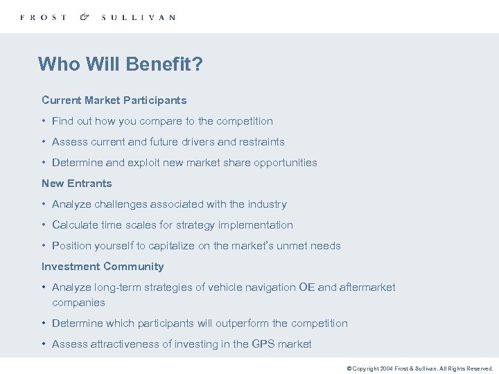 Who Will Benefit? Current Market Participants • Find out how you compare to the competition • Assess current and future drivers and restraints • Determine and exploit new market share opportunities New Entrants • Analyze challenges associated with the industry • Calculate time scales for strategy implementation • Position yourself to capitalize on the market’s unmet needs Investment Community • Analyze long-term strategies of vehicle navigation OE and aftermarket companies • Determine which participants will outperform the competition • Assess attractiveness of investing in the GPS market © Copyright 2004 Frost & Sullivan. All Rights Reserved.