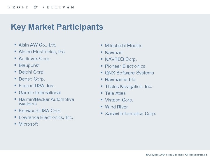 Key Market Participants § § § § § Aisin AW Co. , Ltd. Alpine Electronics, Inc. Audiovox Corp. Blaupunkt Delphi Corp. Denso Corp. Furuno USA, Inc. Garmin International Harmin/Becker Automotive Systems § Kenwood USA Corp. § Lowrance Electronics, Inc. § Microsoft § § § Mitsubishi Electric Navman NAVTEQ Corp. Pioneer Electronics QNX Software Systems Raymarine Ltd. Thales Navigation, Inc. Tele Atlas Visteon Corp. Wind River Xanavi Informatics Corp. © Copyright 2004 Frost & Sullivan. All Rights Reserved.