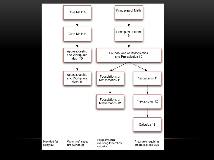 THE MATH CURRICULUM Three Pathways: • Apprenticeship and Workplace Mathematics – designed to provide students with the mathematical understandings and critical-thinking skills identified for entry into the majority of trades and for direct entry into the work force. • Foundations of Mathematics – designed to provide students with the mathematical understandings and critical-thinking skills identified for post-secondary studies in programs that do not require the study of theoretical calculus. • Pre-calculus - designed to provide students with the mathematical understandings and critical-thinking skills identified for entry into post-secondary programs that require the study of theoretical calculus.