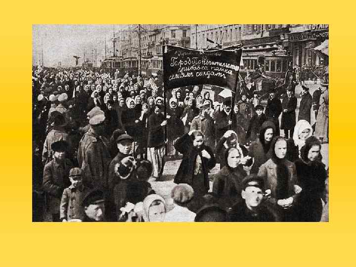 In 1917 demonstrations marking International Women's Day in Petrograd, Russia, on the last Thursday in February (which fell on March 8 on the Gregorian calendar) initiated the February Revolution. Women in Saint Petersburg went on strike that day for "Bread and Peace"