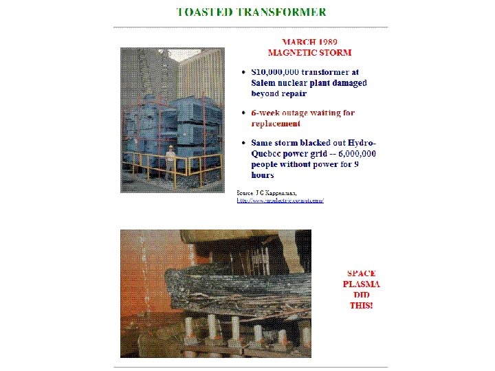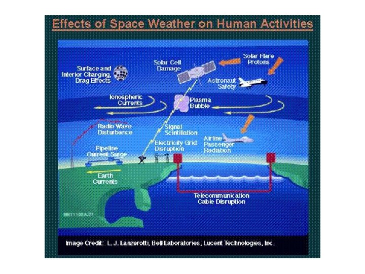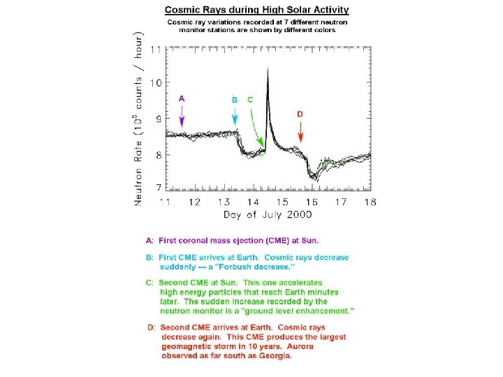 CORONAL MASS EJECTION EFFECTS AT EARTH Prompt Effect: Energetic Particles (GLE) Delayed Effect: Geomagnetic Disturbance • Energetic particles (~ 1 Ge. V) accelerated near Sun • Occurs 5 -20 min after CME lift-off • Charged particles follow magnetic field line • Particles arrive at Earth 10 -30 minutes later, if Earth is near the right magnetic field line • Interplanetary CME arrives at 1 AU 18 hours to 4 days later • Impact of the ICME plasma with Earth’s magnetic field causes a geomagnetic disturbance • The ICME suppresses Galactic cosmic rays, an effect called a Forbush decrease