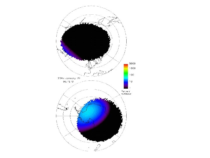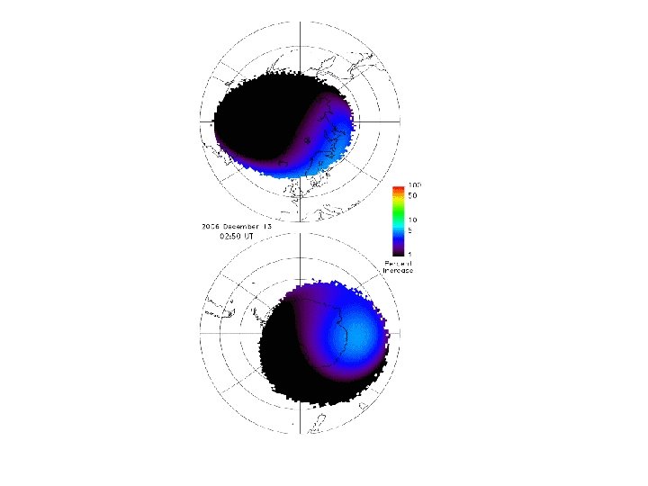 MAPPING RADIATION INTENSITY IN POLAR REGIONS: METHOD • • First, the asymptotic viewing directions of the neutron monitor array are determined, and the cosmic ray pitch angle distribution (here modeled as a constant plus exponential function of pitch angle cosine) is computed in GSE coordinates by least-square fitting To form the map, a preliminary computation is done at each grid point to determine if a 1 GV proton is “allowed. ” If it is, then that location is considered to have a geomagnetic cutoff below the atmospheric cutoff, and the grid point is included in the map. The asymptotic viewing direction at the center of the grid point is then computed in GSE coordinates for a median rigidity particle, permitting the “pitch angle” for the location to be determined. From the model pitch angle distribution, the predicted intensity for that grid point is computed and plotted by color code.