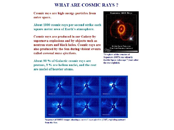 OBSERVATION OF COSMIC RAYS WITH GROUND-BASED DETECTORS • Ground-based detectors measure byproducts of the interaction of primary cosmic rays (predominantly protons and helium nuclei) with Earth’s atmosphere • Two common types: – Neutron Monitor Typical energy of primary: ~1 Ge. V for solar cosmic rays, ~10 Ge. V for Galactic cosmic rays – Muon Detector / Hodoscope Typical energy of primary: ~50 Ge. V for Galactic cosmic rays (surface muon detector)