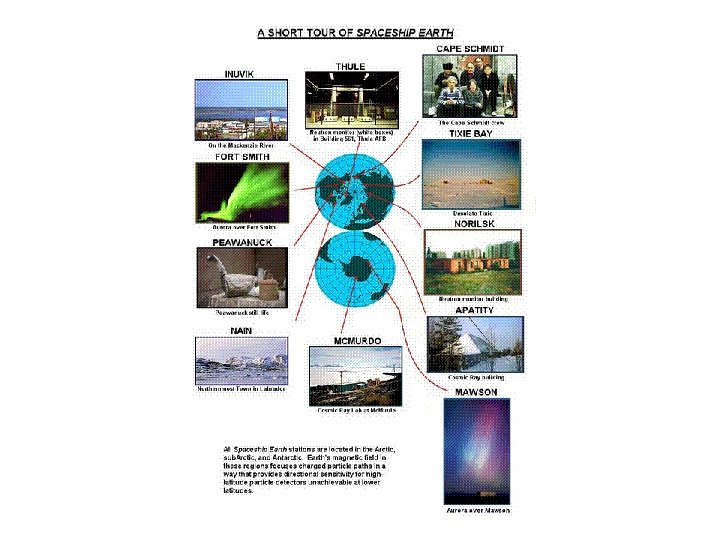 SPACESHIP EARTH VIEWING DIRECTIONS • • • Optimized for solar cosmic rays 9 stations view equatorial plane at 40 -degree intervals Thule, Mc. Murdo, Barentsburg provide crucial 3 -dimensional perspective Solid symbols denote station geographical locations. Average viewing directions (open squares) and range (lines) are separated from station geographical locations because particles are deflected by Earth's magnetic field. STATION CODES IN: Inuvik, Canada FS: Fort Smith, Canada PE: Peawanuck, Canada NA: Nain, Canada BA: Barentsburg, Norway MA: Mawson, Antarctica AP: Apatity, Russia NO: Norilsk, Russia TB: Tixie Bay, Russia CS: Cape Schmidt, Russia TH: Thule, Greenland MC: Mc. Murdo, Antarctica