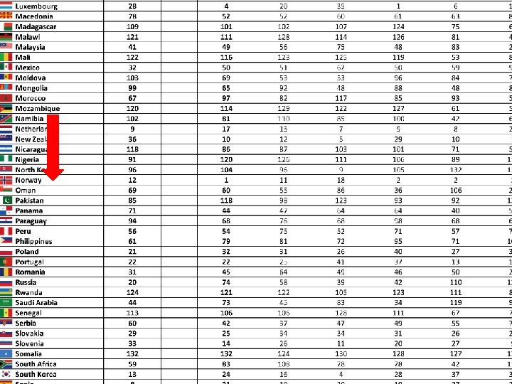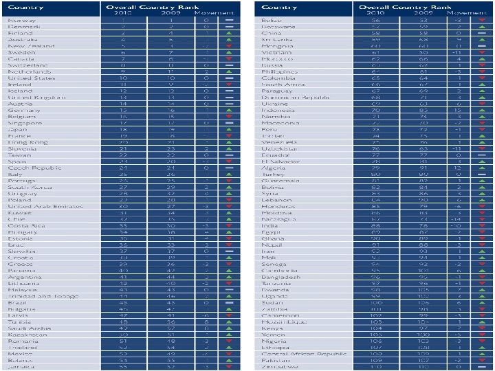 • 25 Italy 29 30 32 19 18 30 27 30 • 26 Portugal 40 28 24 20 27 17 24 63 • 27 South Korea 15 18 31 8 30 33 64 59 • 28 Uruguay 46 52 29 37 40 22 11 34 • 29 Poland 37 38 35 26 32 21 32 25 • 30 United Arab Emirates 30 24 38 34 35 24 54 36 • 31 Kuwait 20 31 36 55 36 29 34 28 • 32 Chile 39 33 21 52 46 37 26 64 • 33 Costa Rica 36 44 26 58 41 48 20 45 • 34 Hungary 48 42 33 31 28 26 50 55 • 35 Estonia 59 23 23 36 39 36 68 43 • 36 Israel 27 25 28 28 23 90 89 17 • 37 Slovakia 47 36 39 32 29 32 63 40 • 38 Croatia 53 37 48 44 33 34 38 41 • 39 Greece 41 35 46 21 22 31 86 100 • 40 Panama 50 41 52 50 63 41 39 37 • 41 Argentina 42 46 86 39 31 42 37 47 • 42 Lithuania 76 39 45 35 38 35 70 49 • 43 Malaysia 21 34 34 45 44 52 90 90 • 44 Trinidad and Tobago 58 40 54 67 61 49 29 72 • 45 Brazil 32 49 60 75 55 76 25 56 • 46 Bulgaria 75 55 57 48 45 40 40 80 • 47 Latvia 81 32 47 33 42 45 67 92 • 48 Tunisia 49 45 50 41 50 44 91 69 • 49 Saudi Arabia 28 48 49 65 49 71 103 18 • 50 Kazakhstan 51 72 87 46 56 47 53 33 • 51 Romania 67 50 65 43 53 43 49 94