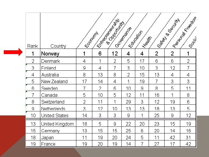 THE 2010 LEGATUM PROSPERITY INDEX TABLE RANKINGS Economie, Antreprenoriat & Oportunităţi, Guvernanţă, Învăţământ, Sănătate , Siguranţă & Securitate , Libertate personală , Capital social • 1 Norway 1 6 12 4 4 2 2 1 • 2 Denmark 4 1 2 5 17 6 6 2 • 3 Finland 9 4 7 3 10 3 12 7 • 4 Australia 8 13 8 2 15 13 4 4 • 5 New Zealand 17 14 4 1 19 7 3 3 • 6 Sweden 7 2 6 10 9 8 5 11 • 7 Canada 5 10 5 12 11 16 1 8 • 8 Switzerland 2 11 1 29 3 12 19 6 • 9 Netherlands 3 12 10 13 13 18 13 5 • 10 United States 14 3 3 9 1 25 9 12 • 11 Ireland 22 7 14 15 14 4 7 10 • 12 Iceland 38 9 17 6 2 1 8 14 • 13 United Kingdom 18 5 9 22 20 23 15 9 • 14 Austria 12 16 13 17 8 15 23 15 • 15 Germany 13 15 15 25 6 20 14 16 • 16 Belgium 16 21 16 18 12 19 10 19 • 17 Singapore 6 8 11 30 24 5 36 54 • 18 Japan 11 19 20 24 5 11 42 31 • 19 France 19 20 19 14 7 27 17 42 • 20 Hong Kong 10 17 18 53 34 14 16 24 • 21 Slovenia 34 26 27 16 16 9 22 38 • 22 Taiwan 25 22 37 7 26 10 28 52 • 23 Spain 33 27 22 11 25 38 18 35 • 24 Czech Republic 26 29 30 27 21 28 30 32 • 25 Italy 29 30 32 19 18 30 27 30