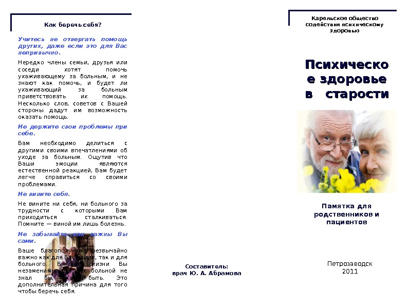 Презентация Психическое здоровье в старости Памятка для родственников и пациентов