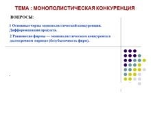 ТЕМА : МОНОПОЛИСТИЧЕСКАЯ КОНКУРЕНЦИЯ ВОПРОСЫ: 1 Основные черты