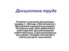 Дисциплина труда Понятие и значение дисциплины труда(д.т.). Методы