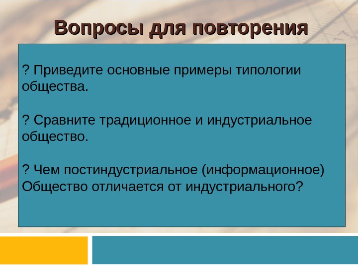 Вопросы для повторения ? Приведите основные примеры типологии